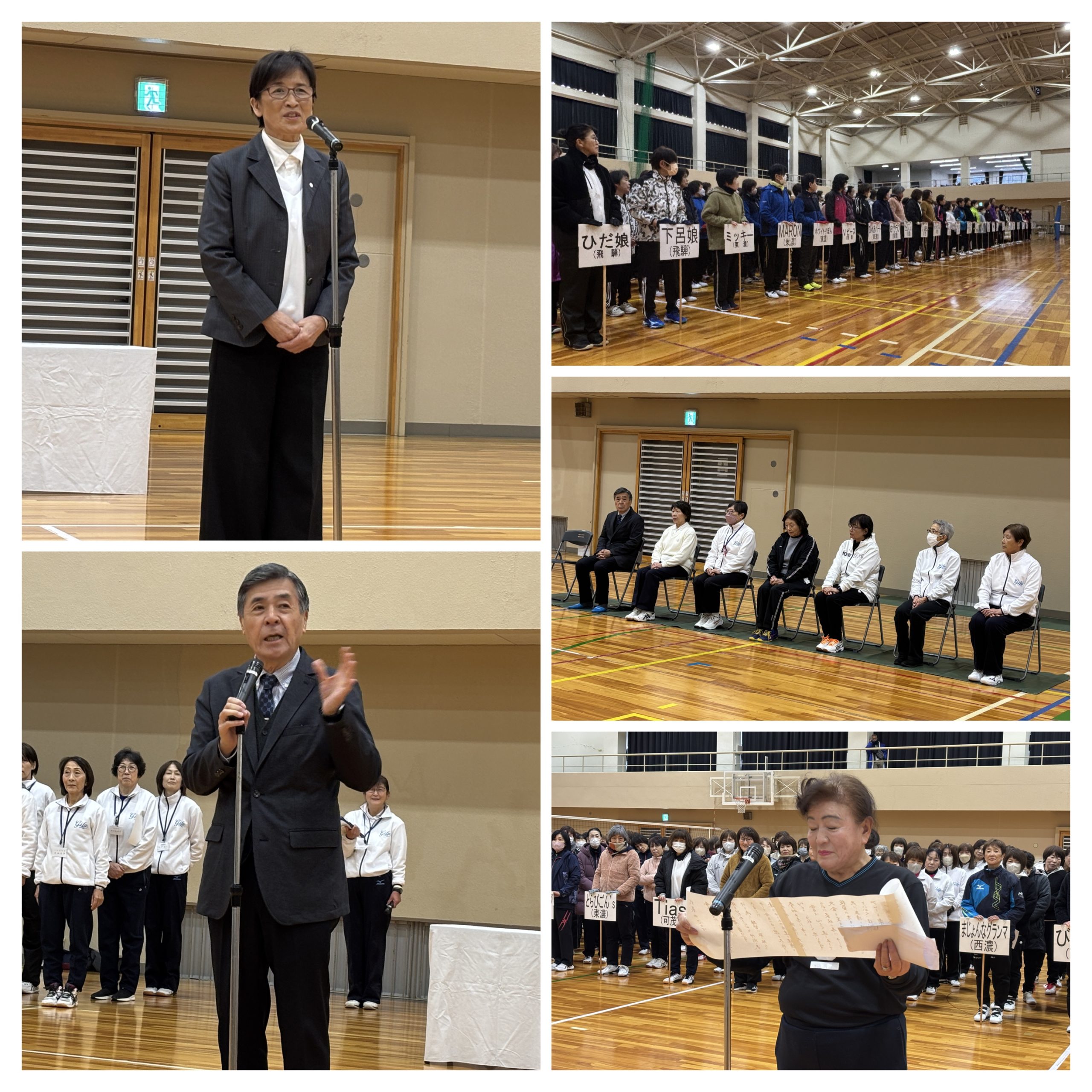 開会式では山内登 下呂市長の温かい歓迎の挨拶を頂き、KAYOキャプテンによるチーム代表のことばでは、廣瀬会長とアイコンタクトをとりながら笑顔で述べられ、岐阜県ママさんバレーボール連盟主催の本年度最後の大会にふさわしいことばでした。