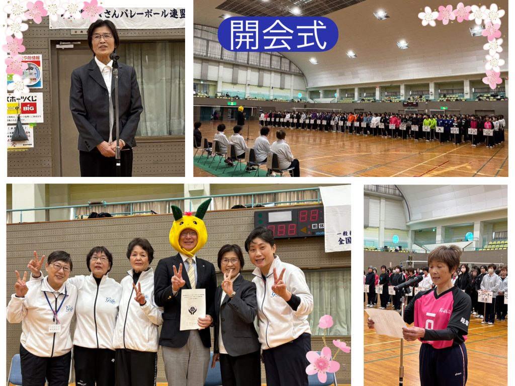 開会式の、竹中誉 池田町長扮するいけキャラ ちゃちゃまる(池田町マスコットキャラクター)の暖かい歓迎と激励のことばと、チーム代表のことばの「ボールを繋ぐ喜びを感じ、”生涯現役”を目標に練習に励んでいます」の力強いことばに加え、体育館を望む霞間ヶ渓〈かまがたに〉のところどころに残る桜と新芽の山々が、春のエネルギーを感じさせ、選手の躍動感溢れるプレーを盛り上げ生涯バレーを楽しみました。